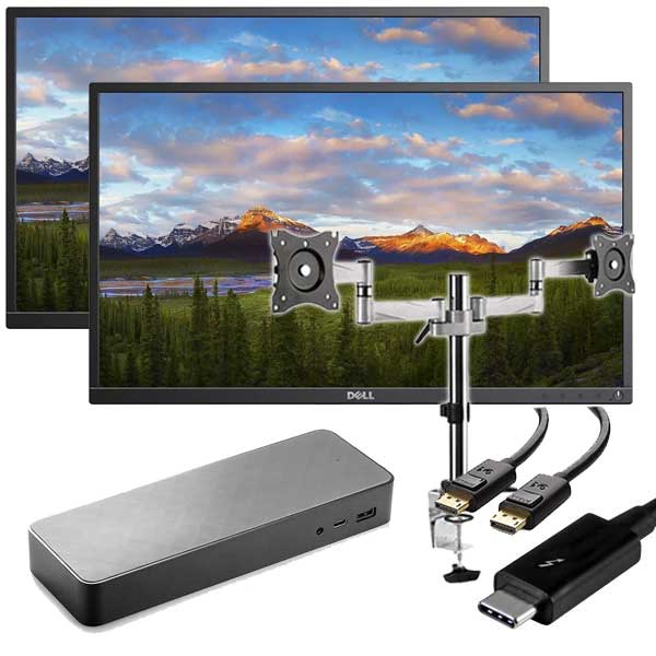The refurbished Dell monitors are 24″ each and deliver clear and vivid images, making them ideal for a wide range of applications, from graphic design to video editing. The new desk mount dual monitor stand ensures that you can easily adjust the monitors to your preferred height, angle, and orientation, while freeing up valuable desk space. The USB-C Docking Station allows you to connect a variety of peripherals to your laptop, including an external hard drive, a keyboard, a mouse, and more, with a single cable.